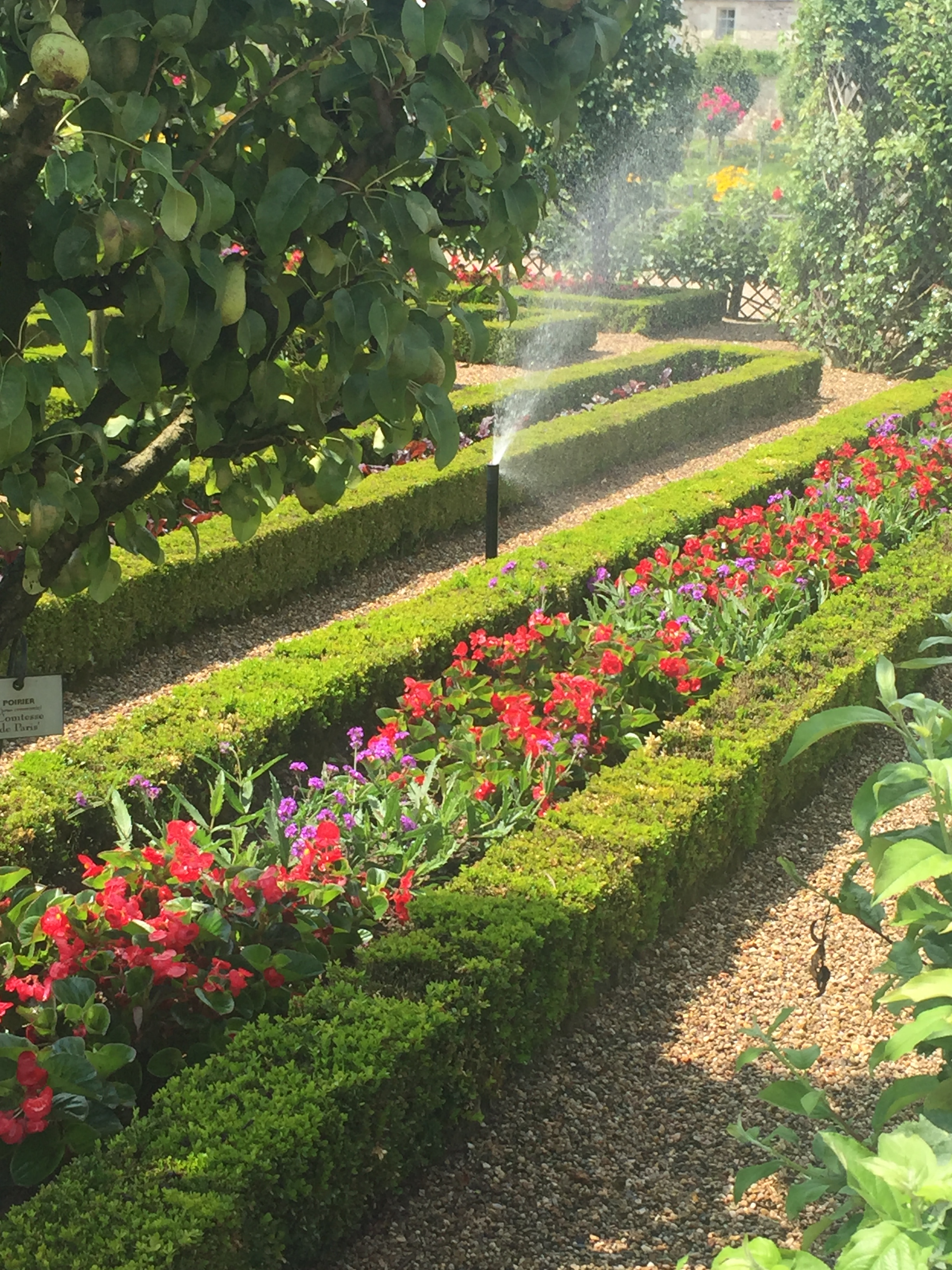 The gardens are what are most remarkable about the chateau. They are not very extensive, but are laid out in meticulous patterns. Since 2009, the organic method has been adopted so no artificial fertilisers are used. Rotation planting is part of this method, but they not only rotate the classes of plants such as Brassica (cabbage family) and Solanum (aubergine, peppers) but the colour is coordinated to give contrasting stripes in between the box hedging which is used to separate each type of plant, interspersed with all of this are roses such as Rose Marlene Dietrich, and deep red and others with wonderful scents and vivid pink colours.